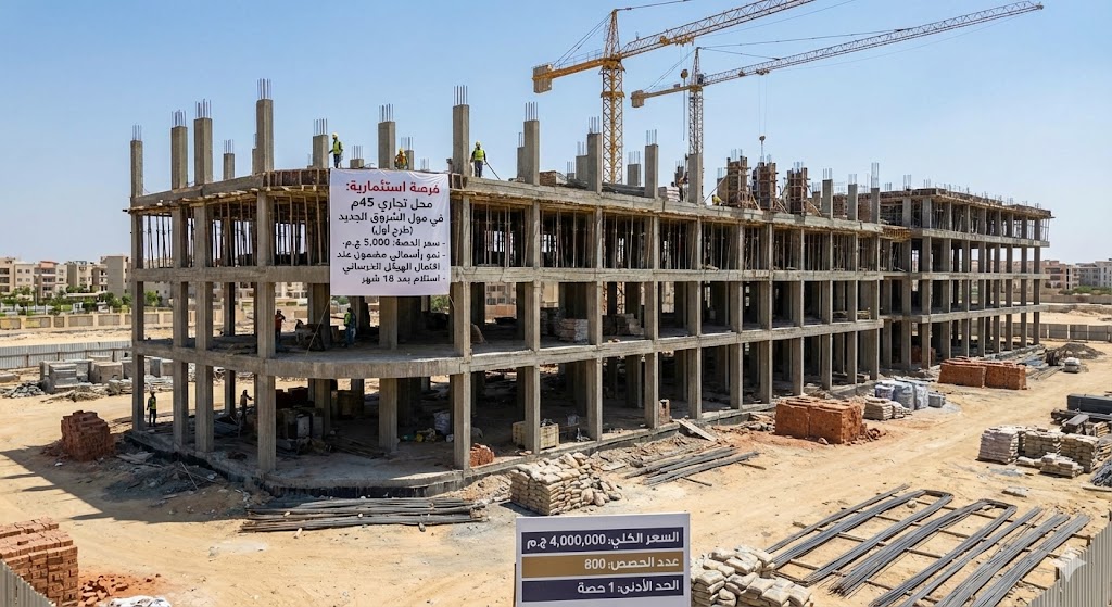 محل تجاري 45م في مول جديد (طرح أول). نشتري الآن بسعر “الافتتاح” بهدف البيع عند اكتمال الهيكل الخرساني وارتفاع السعر تلقائياً.